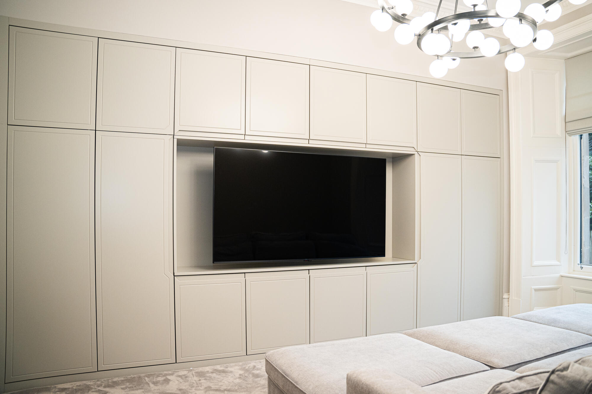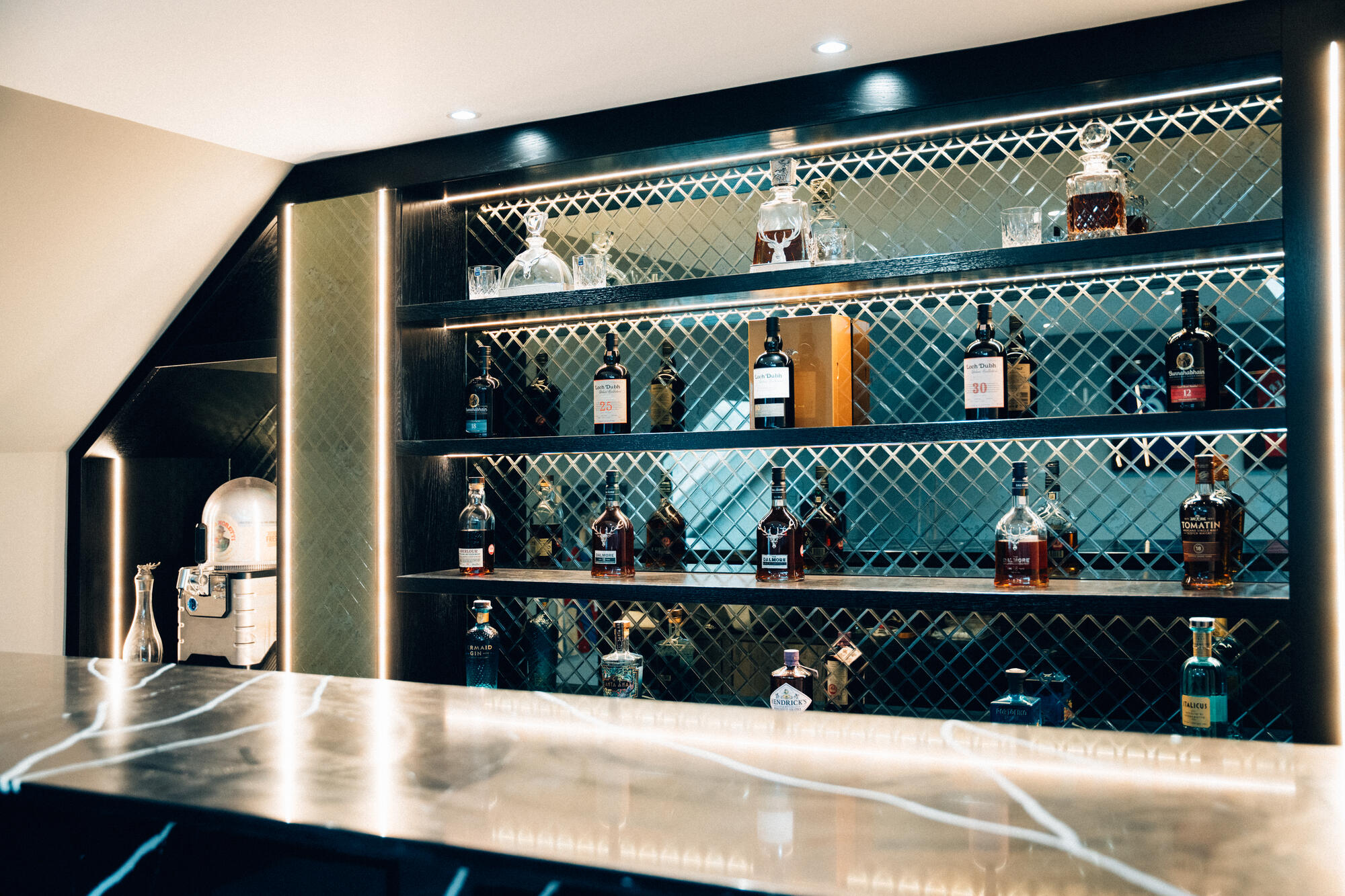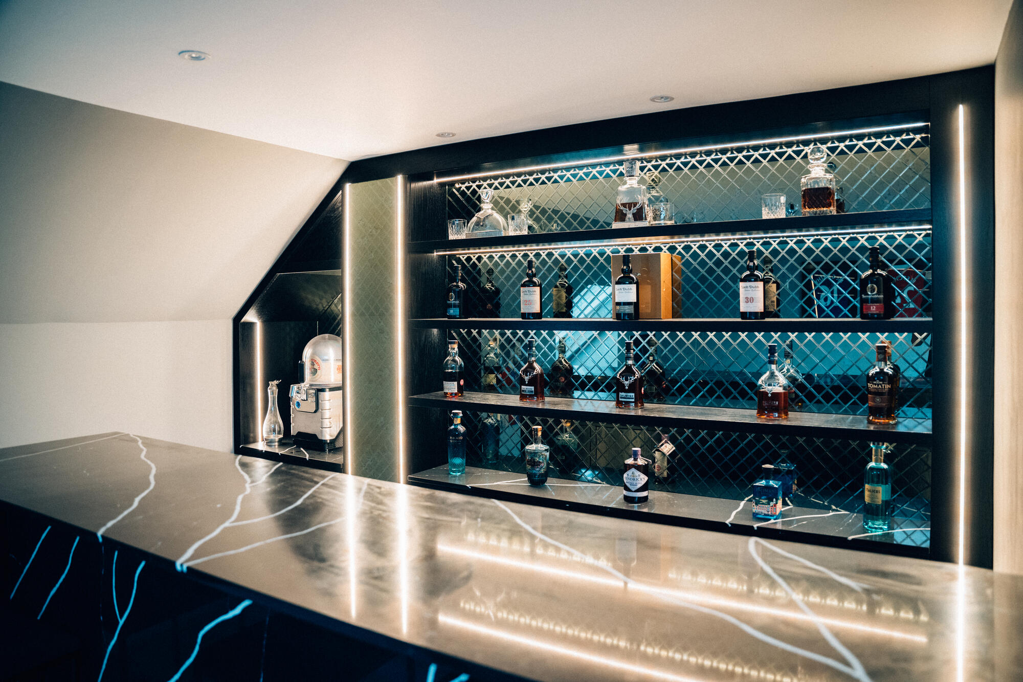 Ingrained Bespoke was commissioned to deliver a complete joinery package across the entire home—carefully tailored to the family’s lifestyle. The project included three full-height wardrobes, a luxury dressing room, two bespoke media units, a home bar, a feature wine rack, and several smaller details that pulled the interiors together.