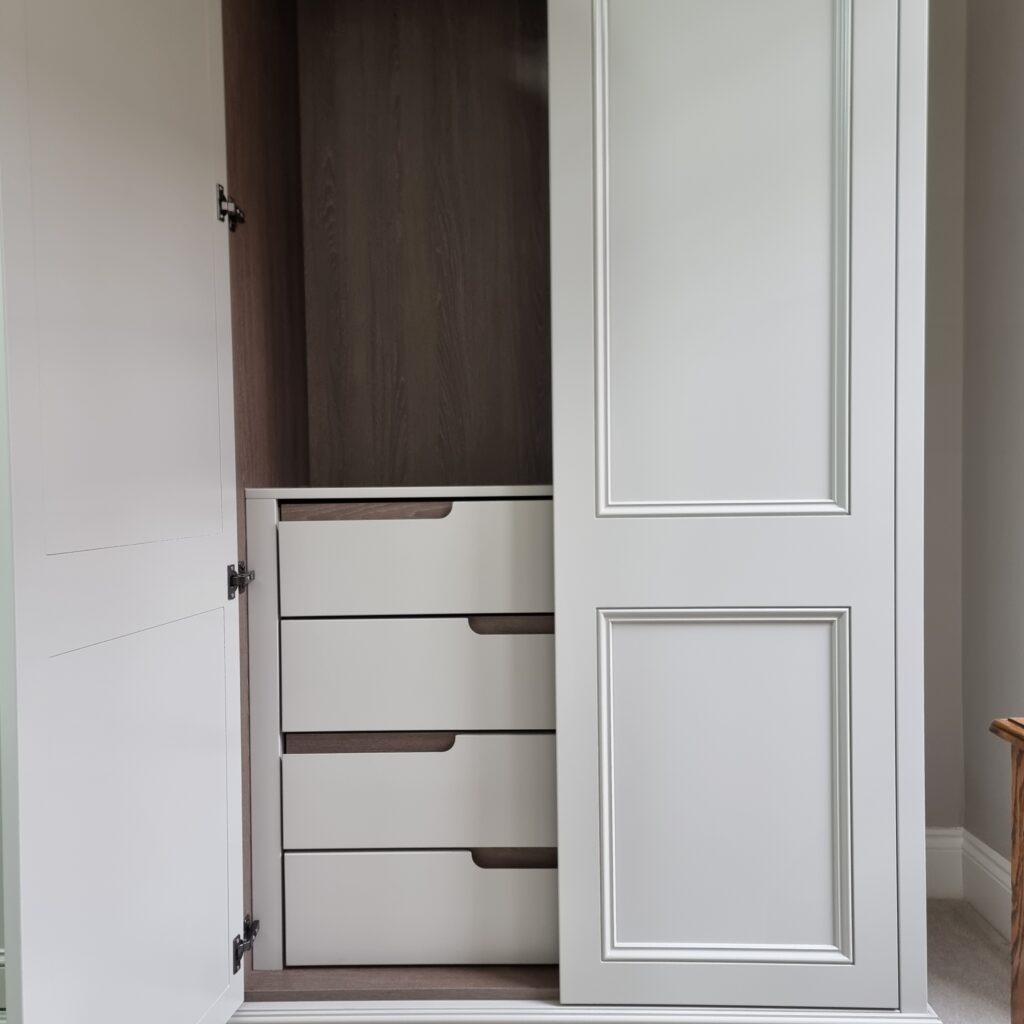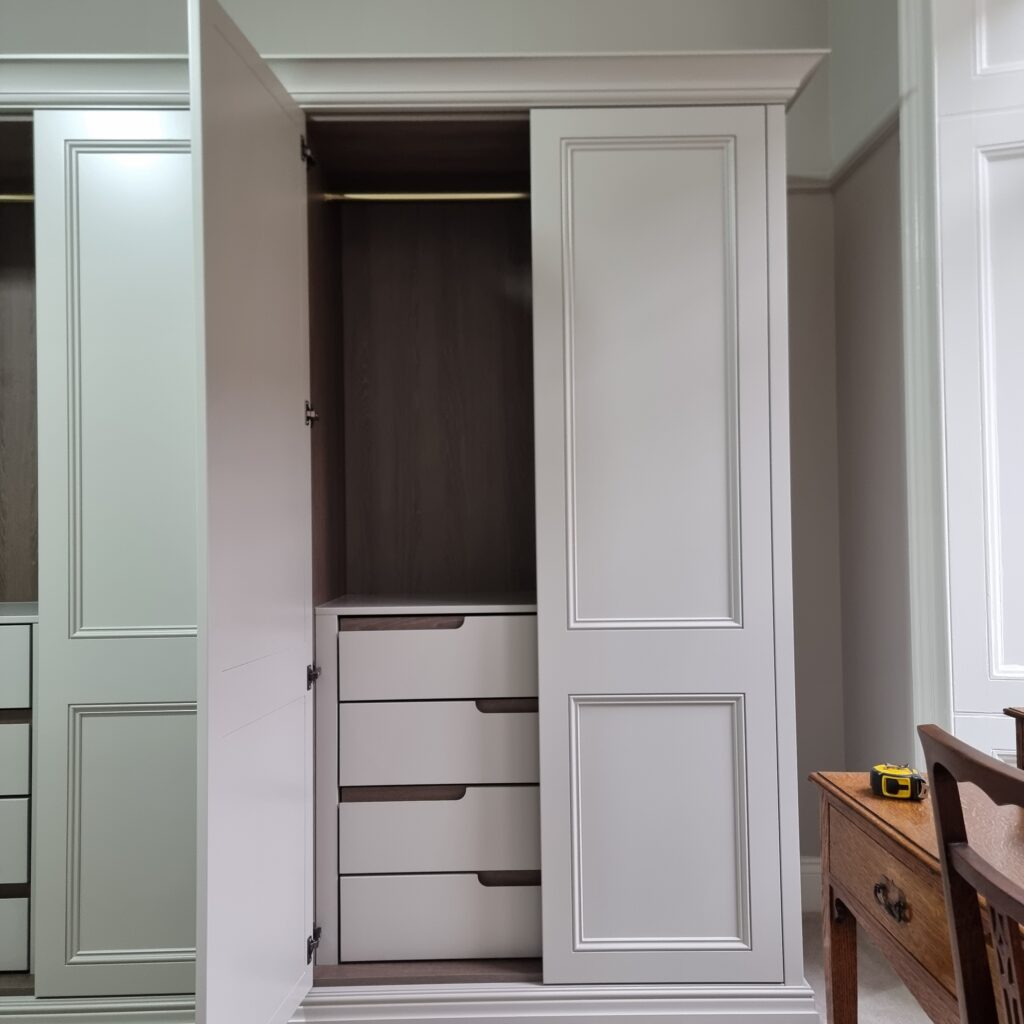 This classic fitted wardrobe for Joyce Taylor in Glasgow’s West End is a masterclass in blending timeless design with modern usability. The exterior features spray-finished doors in a two-panel beaded shaker style—subtle, elegant, and perfectly in keeping with the home’s character.