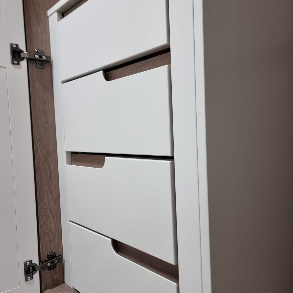Inside, a warm woodgrain MFC finish adds depth and contrast. Four soft-close drawers with slab-style fronts and integrated scooped finger pulls offer easy access without visible hardware, maintaining a clean, streamlined look.