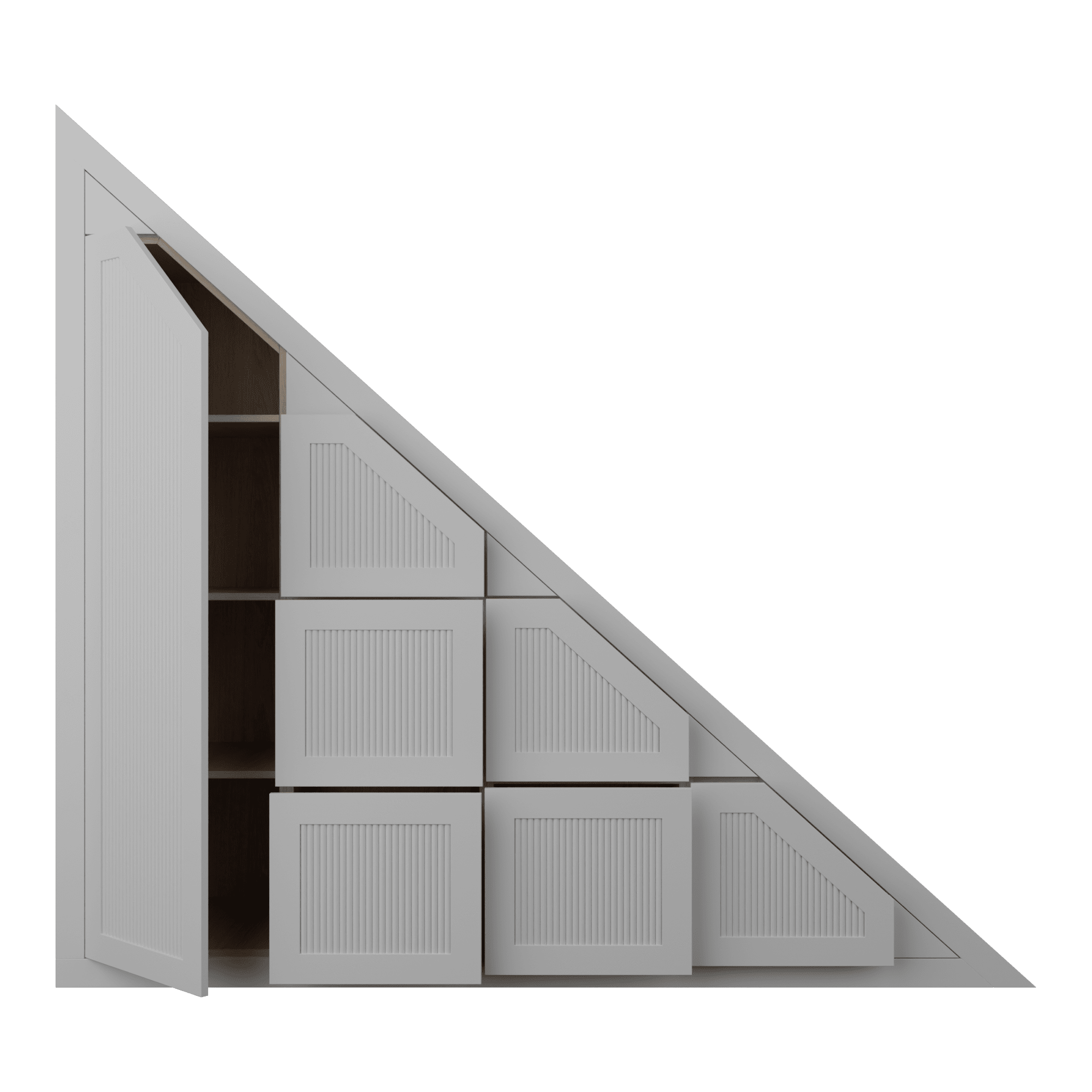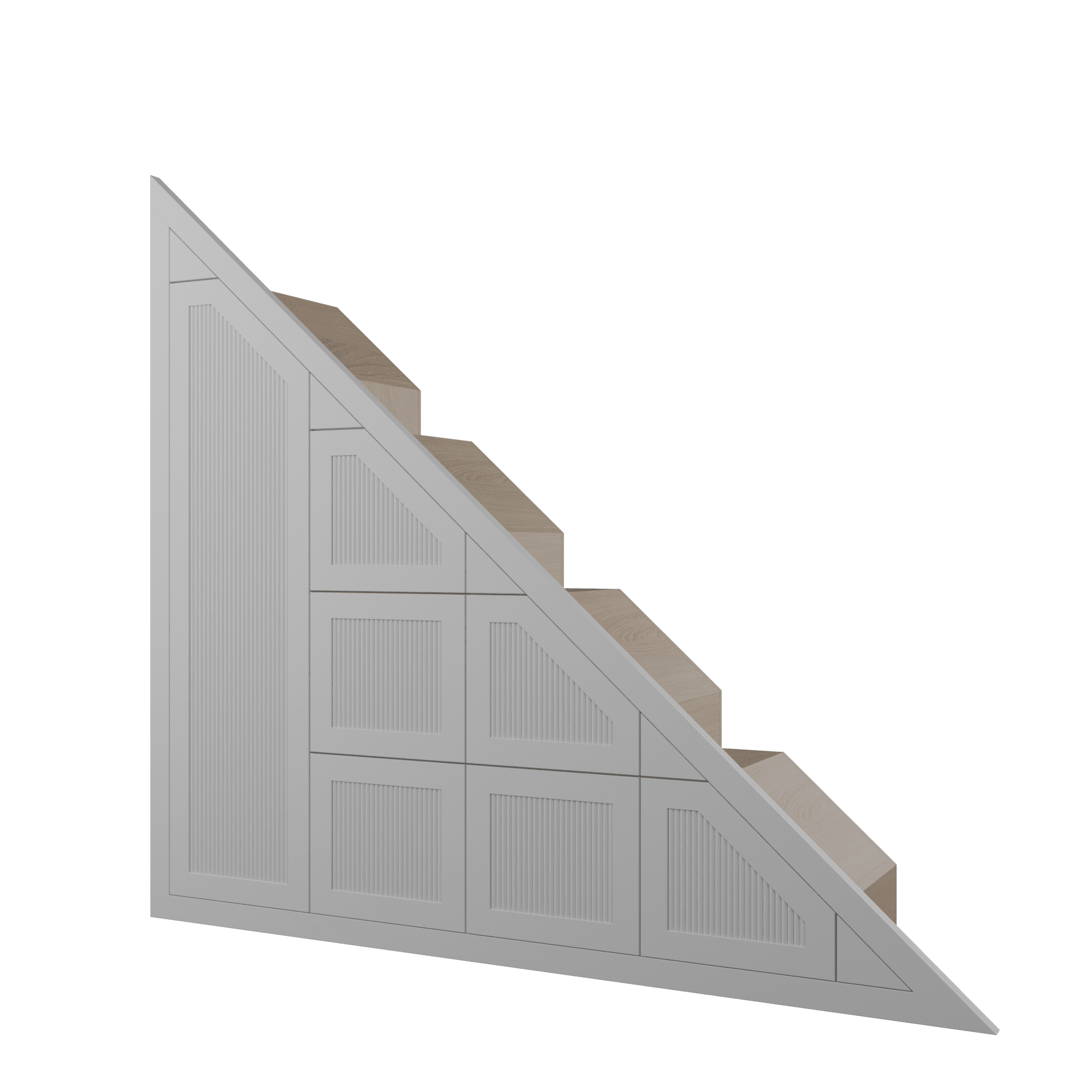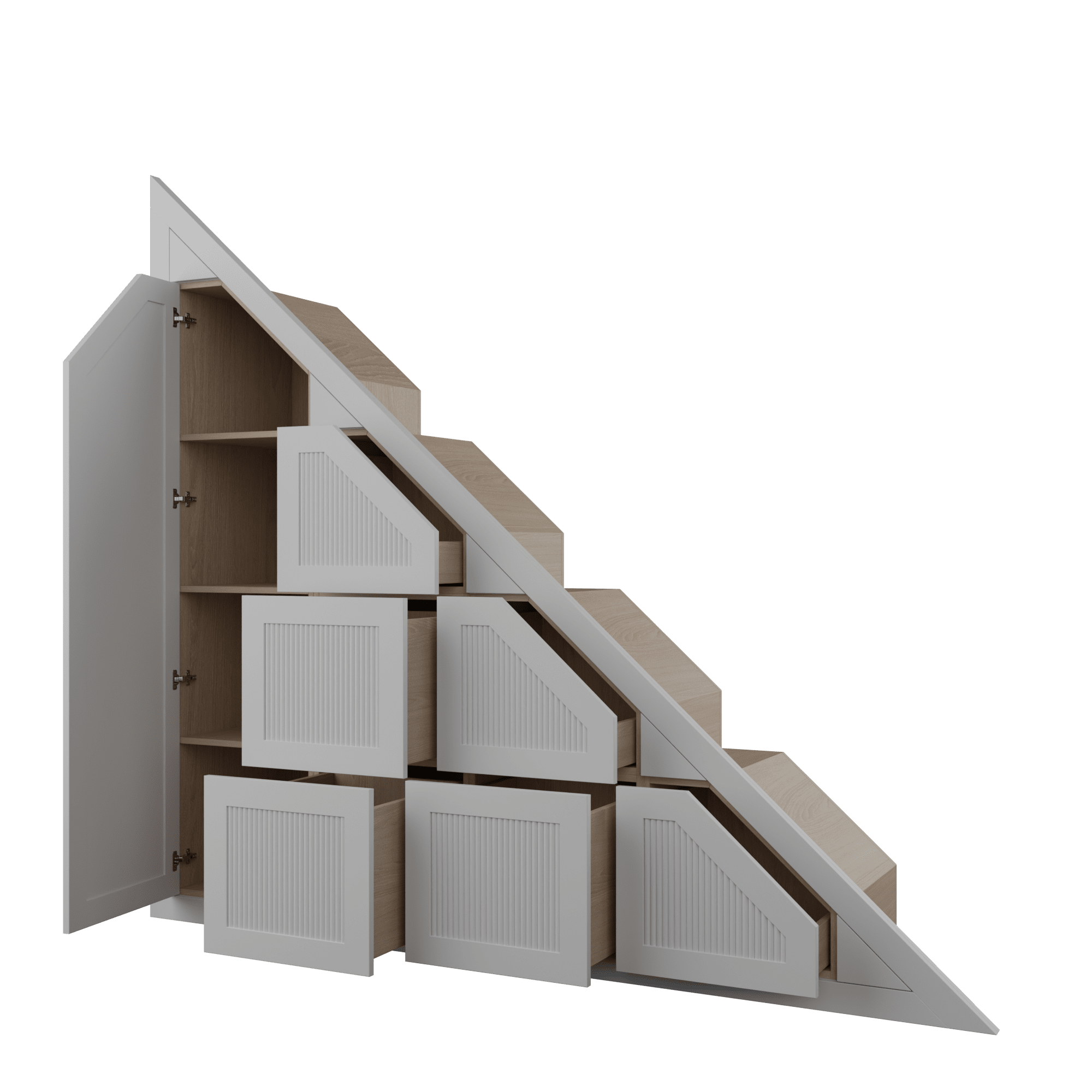 This reeded shaker style understairs storage unit features 6 drawers one cupboard unfinished. It’s designed to fit neatly under your stairs, offering practical and attractive storage for shoes, bags, toys, and other household items. Supplied unfinished, it’s ready for you to paint at home.
