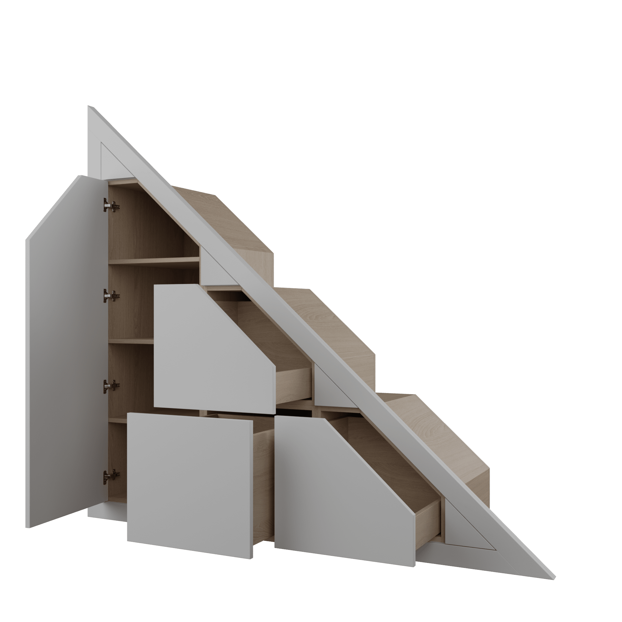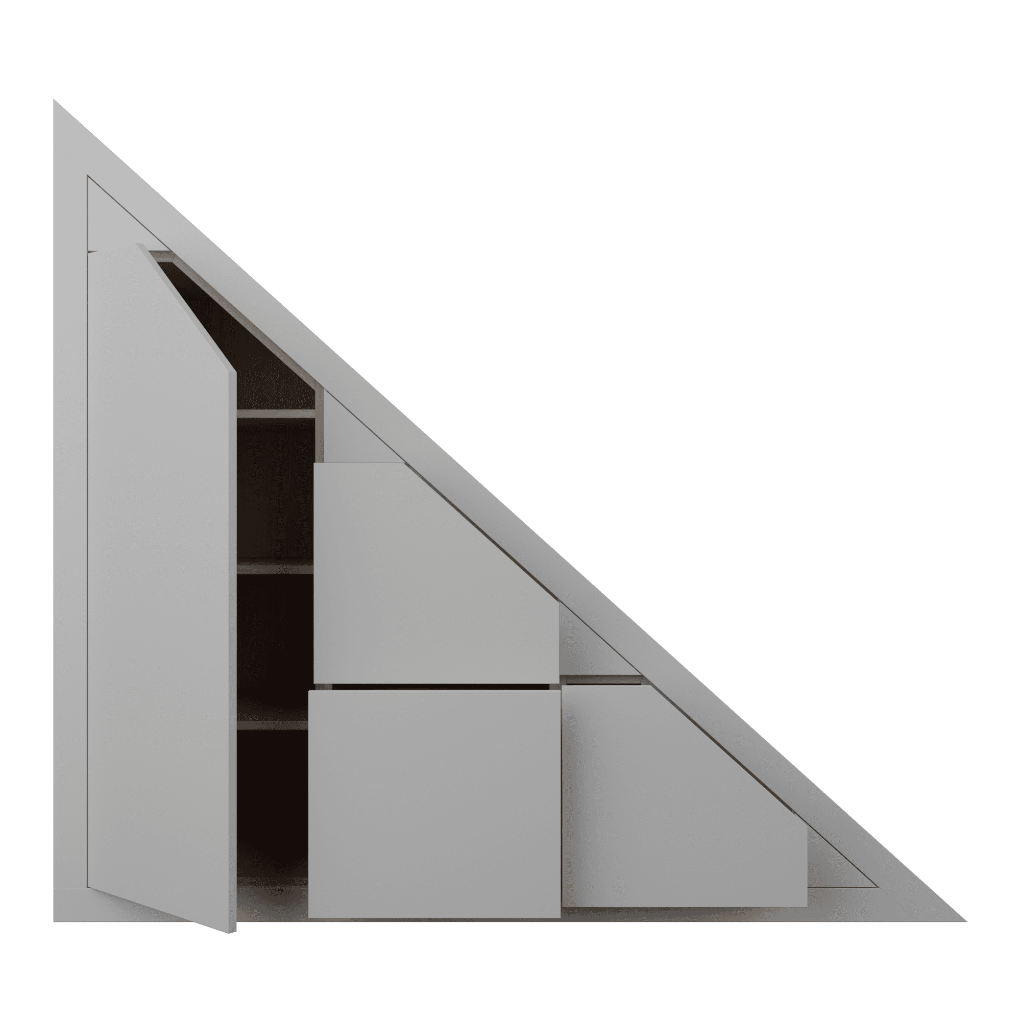 This slab style understairs storage unit features 3 drawers one cupboard unfinished. It’s designed to fit neatly under your stairs, offering practical and attractive storage for shoes, bags, toys, and other household items. Supplied unfinished, it’s ready for you to paint at home.