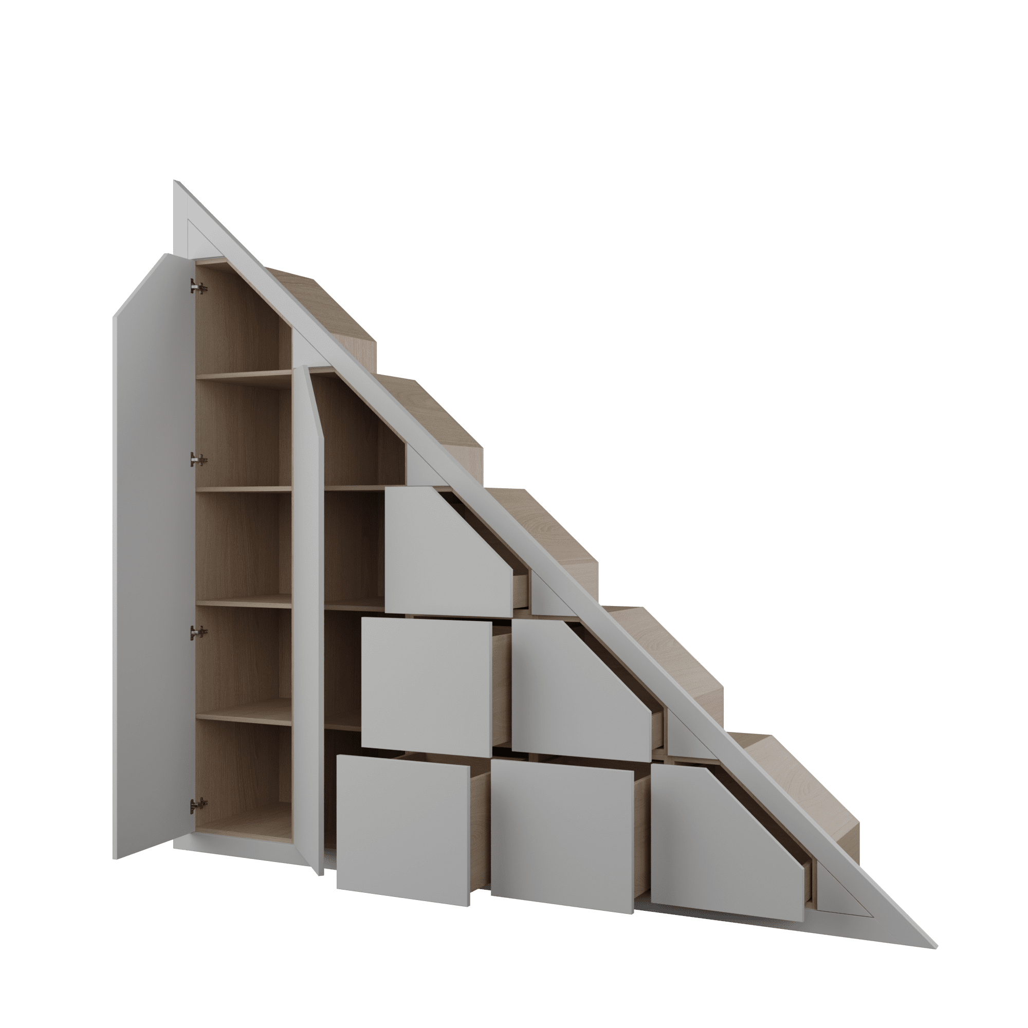 This slab style understairs storage unit features 6 drawers two cupboards unfinished. It’s designed to fit neatly under your stairs, offering practical and attractive storage for shoes, bags, toys, and other household items. Supplied unfinished, it’s ready for you to paint at home.